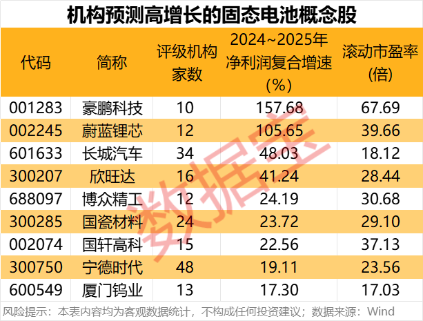 据数据宝统计,2024年前三季度净利润实现增长的固态电池概念股中,机构评级家数超10家且一致预测2024~2025年净利润复合增速超15%的个股有9只。