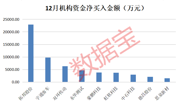 据数据宝统计,上述四大热门科技板块所涉及的潜力股中,12月有9股获机构资金大额买入,净买入金额均超1500万元。