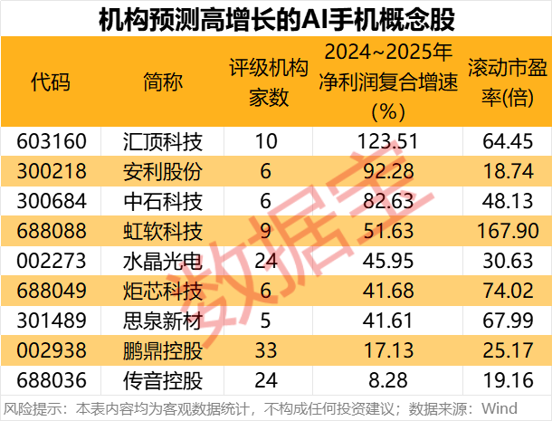 据数据宝统计,2024年前三季度净利润实现增长的AI手机概念股中,机构评级家数超5家且一致预测2024~2025年净利润复合增速超8%的个股有9只。