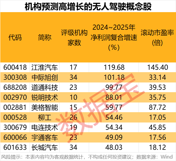据数据宝统计,2024年前三季度净利润实现增长的无人驾驶概念股中,机构评级家数超10家且一致预测2024~2025年净利润复合增速超40%的个股有9只。